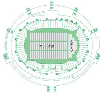 養生パネル(テラプラス)を天然芝上に敷き詰めることで、大規模なアリーナ空間を実現します。アリーナ席は、最大で20,000席が設定可能。スタジアムが巨大コンサート会場に生まれ変わります。